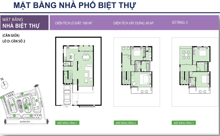 - Mặt bằng biệt thự Golf Park quận 9: Lô D, căn giữa (01 trệt + 02 lầu)
