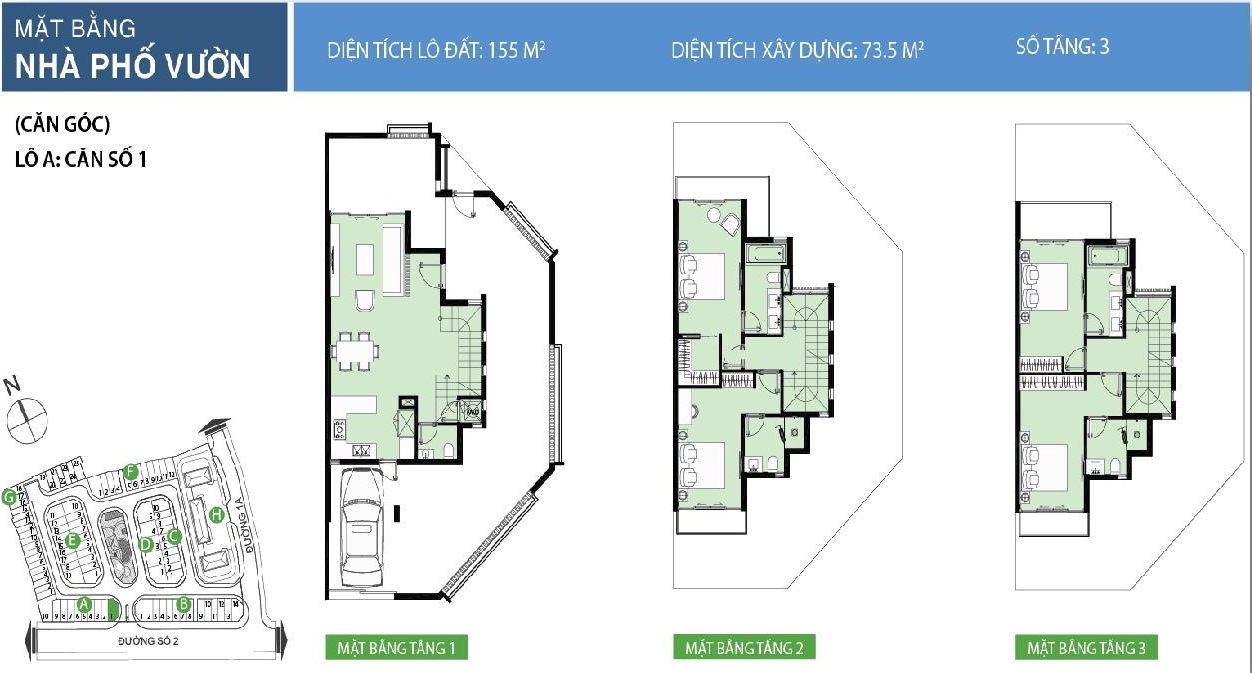 Mặt bằng nhà phố vườn Golf Park: Lô A, căn số 1 (01 trệt + 02 lầu + 01 sân thượng)