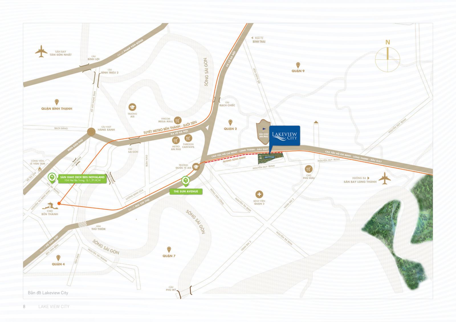 - Dự án Lakeview City Quận 2 có một mặt tiếp giáp đường Song hành cao tốc Long Thành – Dầu Giây với chiều dài 1,1 km trên mặt tiền, một mặt giáp sông Giồng Ông Tố với chiều dài 1,2 km.