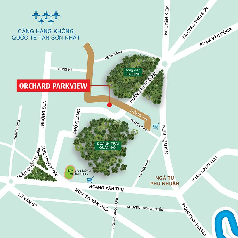Dự án Orchard Parkview tạo lạc tại khu đất đắt đỏ của Phú Nhuận, có vị trí liên kết giao thông thuận tiện: liền kề với sân bay Tân Sơn Nhất, tiếp giáp với tuyến đường huyết mạch Phạm Văn Đồng - tâm điểm kết nối tới các Quận Tân Bình, Quận Phú Nhuận, Quận Bình Thạnh...