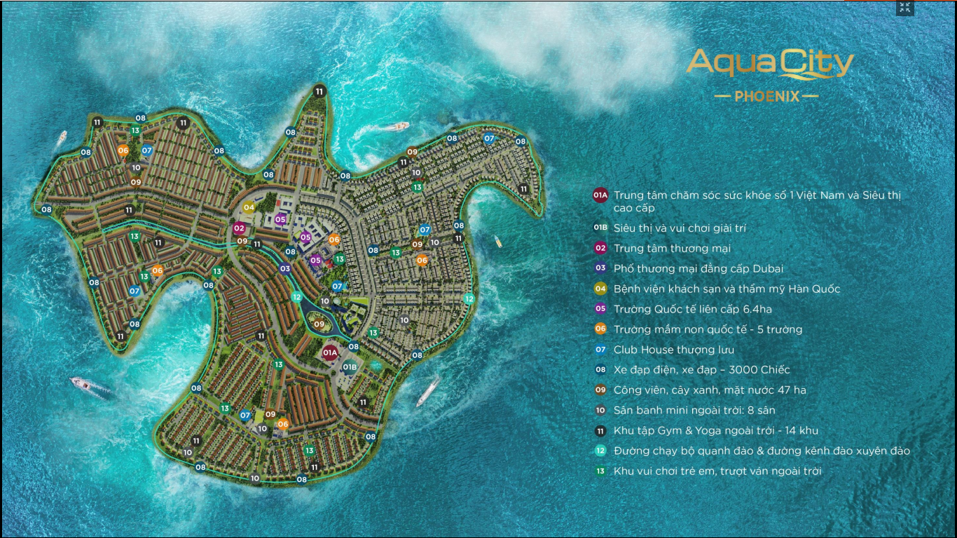 - Phân khu cao cấp của dự án gồm 4 phân khu chính: Aqua City Phoenix South, Phonenix West, Phonenix Central, Phonenix North.