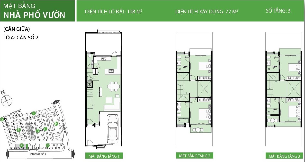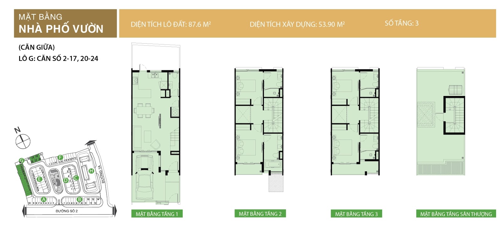 Mặt bằng nhà phố vườn Golf Park: Lô A, căn số 1 (01 trệt + 02 lầu + 01 sân thượng)