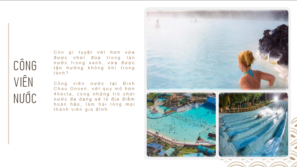 - Nằm giữa thiên nhiên nguyên sơ, phân kỳ Bình Châu Onsen được ban tặng bàu khoáng nóng tự nhiên, hình thành từ các vùng hồ trên núi trong rừng nguyên sinh, cùng hơn 70 điểm phun nước lộ thiên với nhiệt độ trung bình từ 37 độ C đến 82 độ C tùy theo khu vực.