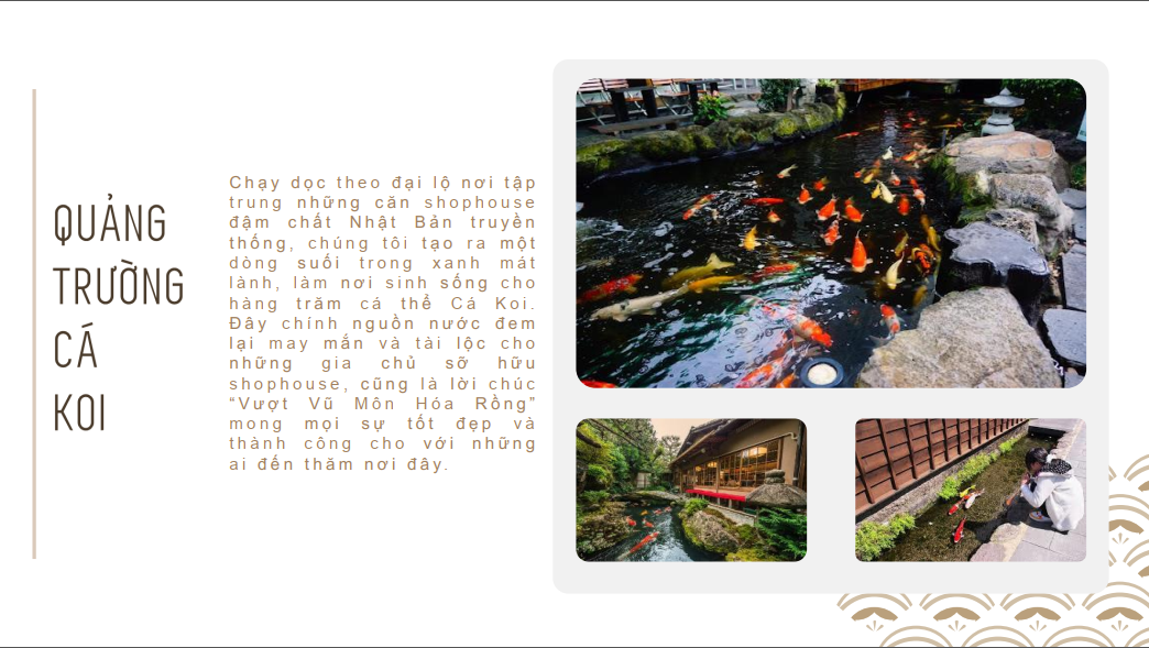 - Chạy dọc theo tuyến phố thương mại là quảng trường cá Koi với ý nghĩa mang lại sự may mắn, sẽ là nơi tập hợp những cửa hàng ẩm thực, dịch vụ đặc sắc phục vụ cho toàn phân kỳ.