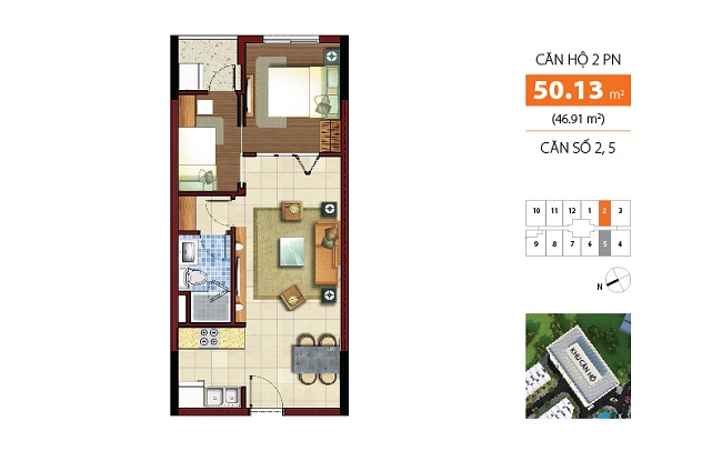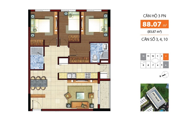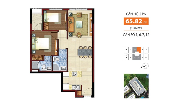 – Diện tích đa dạng khu căn hộ : 50m2, 65m2, 71m2,73m2, 88m2 (từ 2->3 PN).