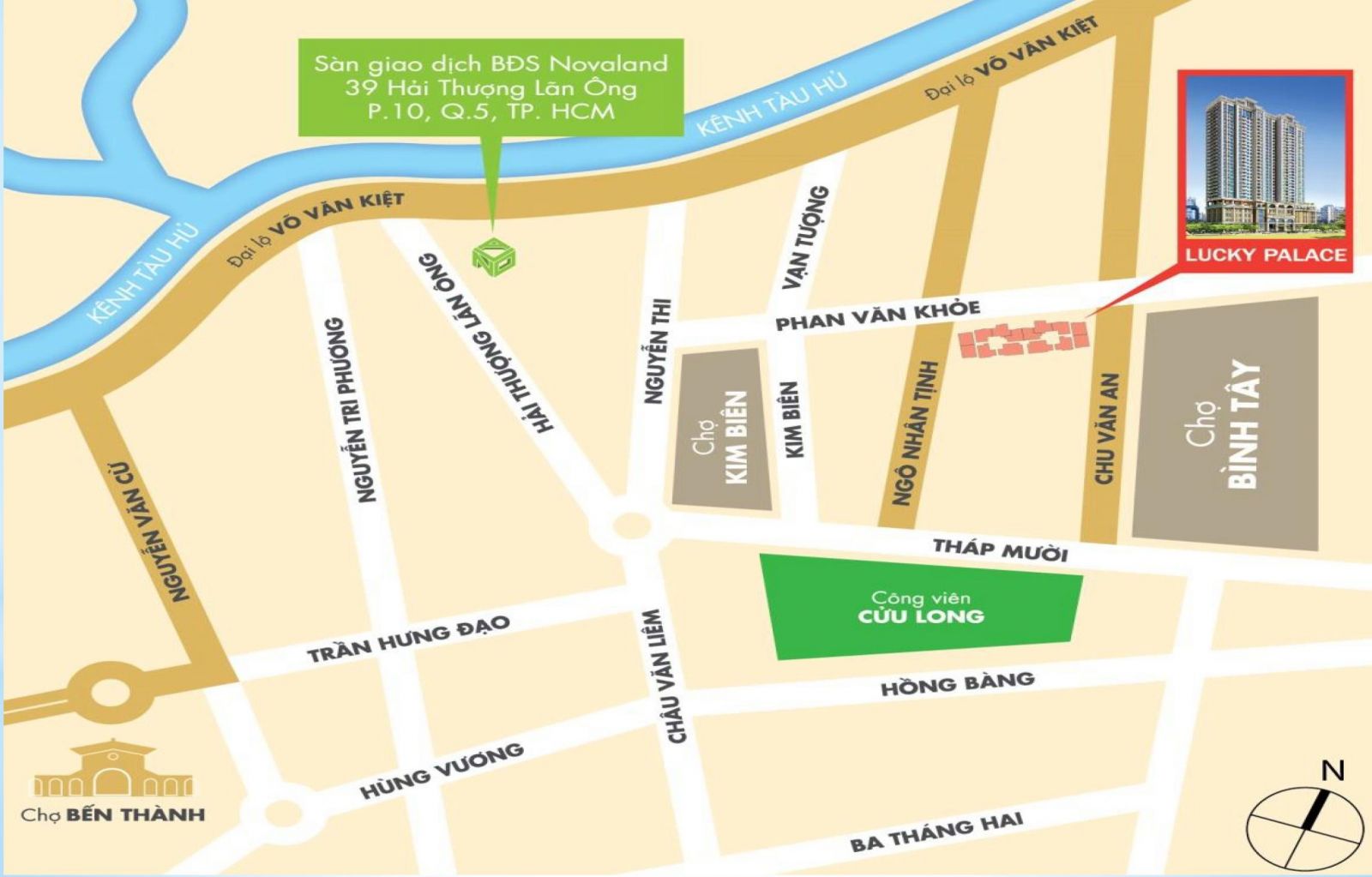 Dự án Lucky Palace nằm ngay trung tâm Quận 6, tiếp giáp 3 mặt tiền đường Phan Văn Khỏe, Ngô Nhân Tịnh và Chu Văn An, từ đây chỉ mất 10 phút để đến trung tâm Quận 1 thông qua đại lộ Võ VĂn Kiệt và kết nối đễ dàng đến các quận trọng điểm khác như: Quận 3,5,8,10,11… Dự án Lucky Palace sở hữu vị trí cực kỳ thuận lợi về giao thương khi nằm giữa các khu chợ lớn và lâu đời như: chợ Kim Biên, chợ Bình Tây và chợ Soái Kình Lâm. Bên cạnh đó đây còn là nơi tập trung cộng đồng dân cư sầm uất, hiện hữu lâu đời, phù hợp để ở và đảm bảo cho khách hàng tỷ suất lợi nhuận cao khi đầu tư.