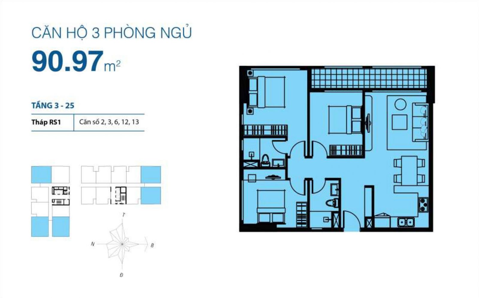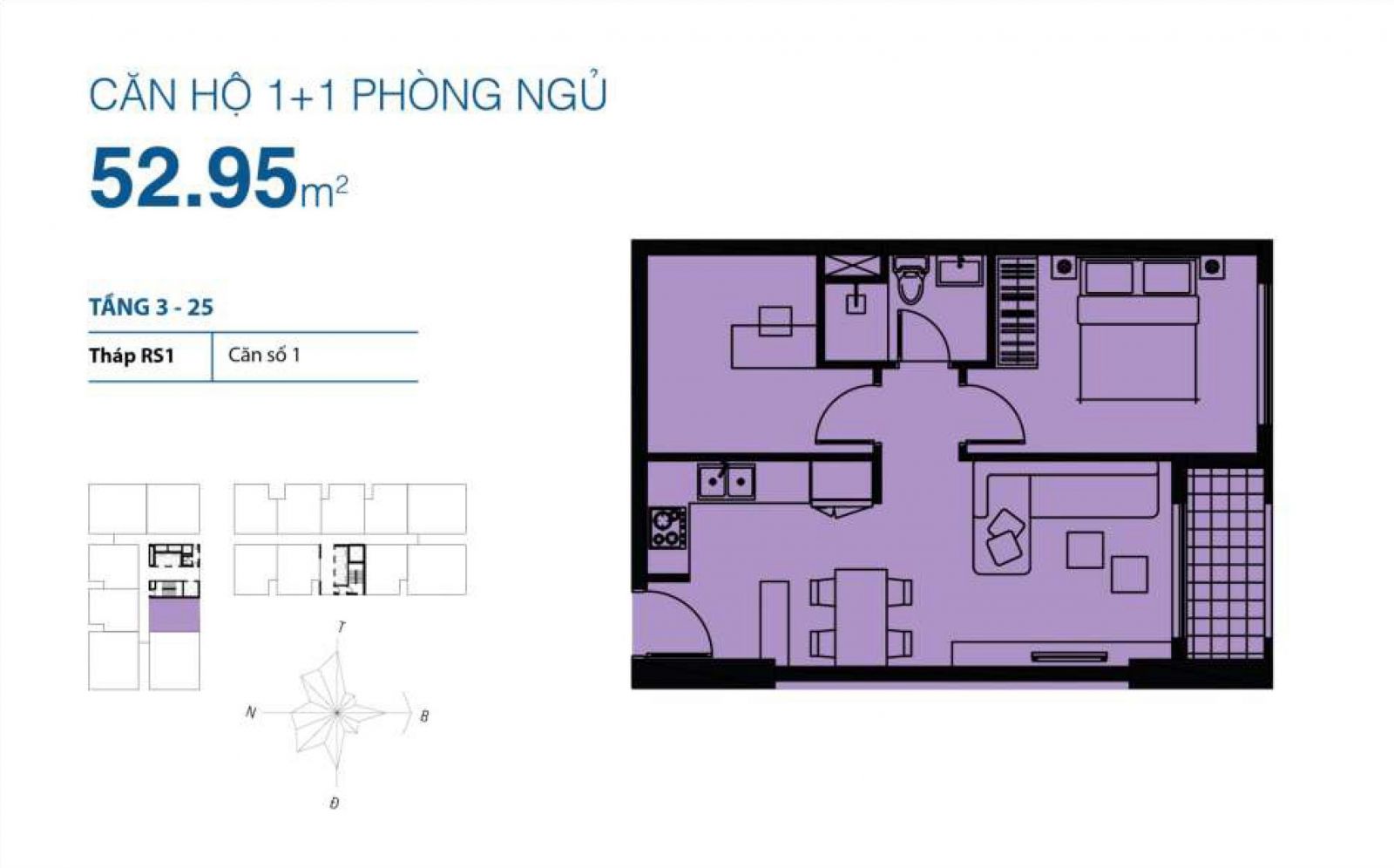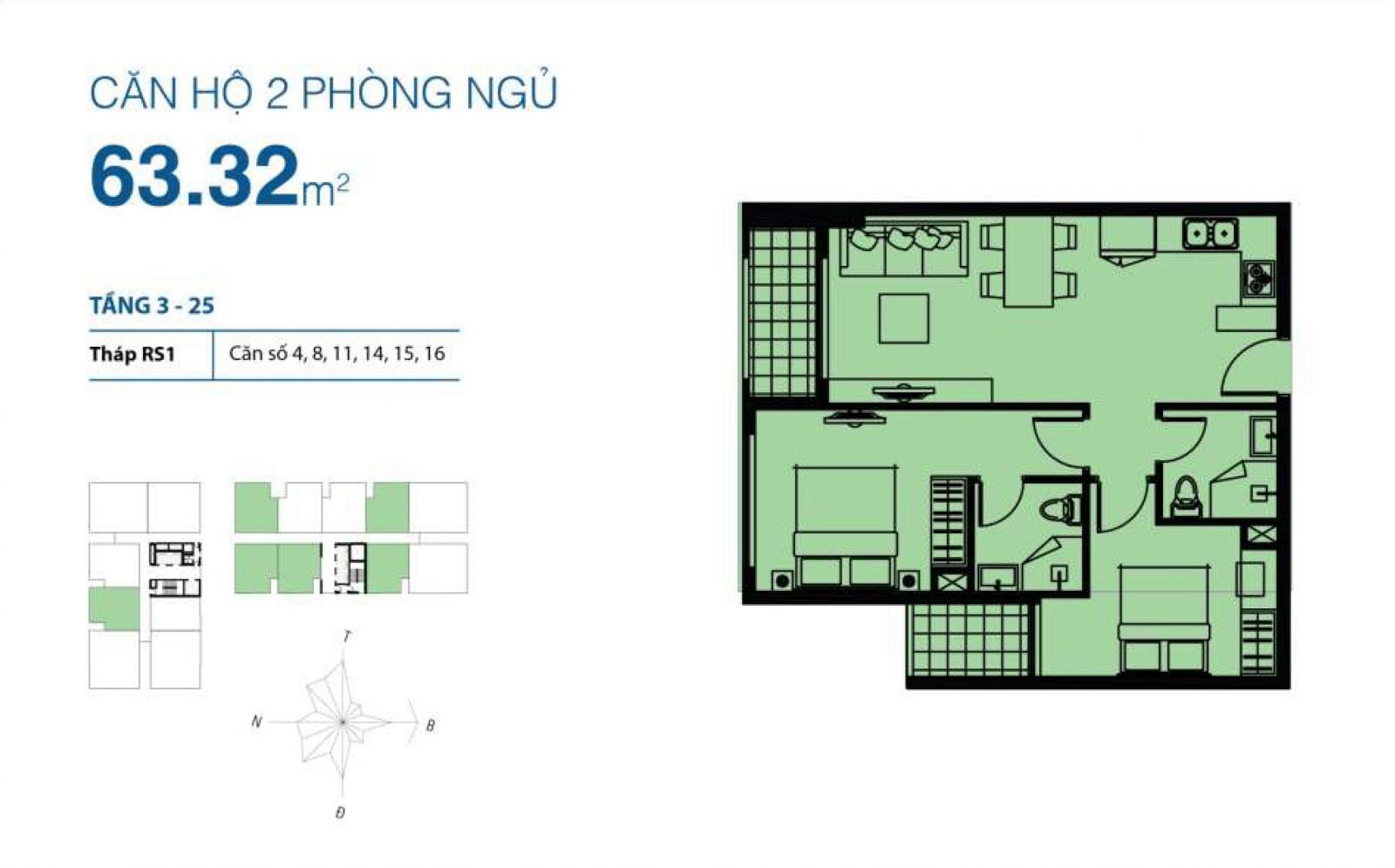 - Diện tích căn hộ: 1PN 53m2, 2PN 63m2 - 65m2, 3PN 82m2 - 93m2