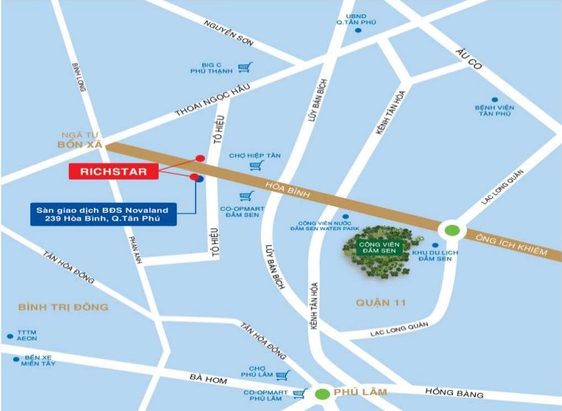 Căn hộ Richstar nằm trãi dài hơn 250m trên mặt tiền đường Hòa Bình, một trong những tuyến đường có mật độ dân cư sầm uất và phát triển bậc nhất của Quận Tân Phú. Dự án Richstar nghiễm nhiên sở hữu hệ thống hạ tầng giao thông cực kỳ thuận tiện. Với Richstar cư dân chỉ mất khoảng 15 phút để di chuyển đến trung tâm thành phố, hay 10 phút để đến sân bay quốc tế Tân Sơn Nhất, đồng thời cũng kết nối đến các Quận, Huyện lân cận như Quận 5, 6, 11, Tân Bình, Bình Tân… một cách dễ dàng.